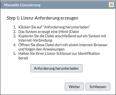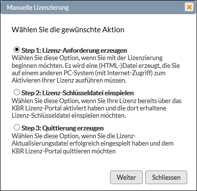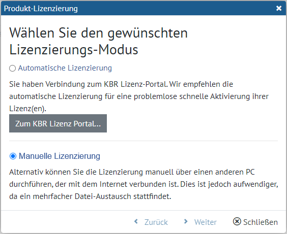 Falls der zu lizenzierende Computer das KBR Lizenzportal unter https://lic.kbr.de mangels direkter Verbindung zum Internet erreichen kann, muss die Lizenzierung manuell durchgeführt werden. Hierbei sind die Lizenzdateien von dem zu lizenzierenden System über Datenträger zu einem PC mit Internetverbindung zu transportieren.