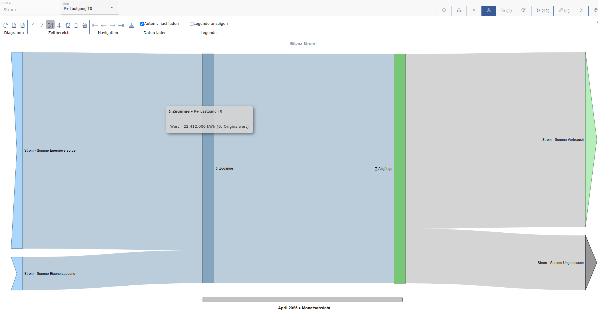 Die Bilanzansicht ermöglicht für eine ausgewählte Messgröße und einen definierten Zeitbereich eine grafische Darstellung der erfassten Mengen.