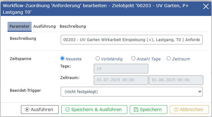 Hierzu muss für die benötigte Messgröße eine Workflow-Zuordnung zu dem Anforderungs-Workflow mit einer Zeitplan-Zuordnung existieren. Der Workflow fordert dann explizit die entsprechende Messgröße für den gewünschten Zeitraum an.