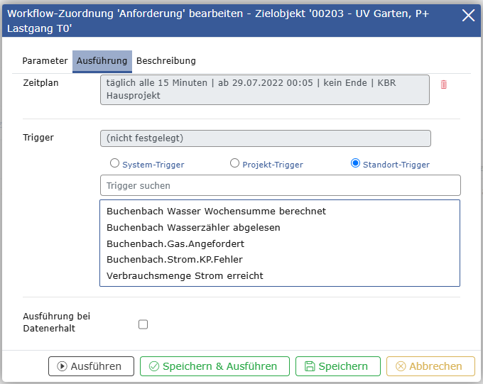 Die Ausführung jeweils wird mit dem Zeitplan ‚täglich alle 15 Minuten‘ gestartet: